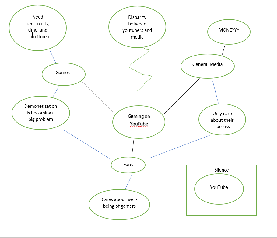 The 3 main groups who are discussing the possibility of becoming a gaming youtuber are extremely different in the way each of them sees this topic. They all seem to be discussing different things about it, whether it be how successful someone can get as a gaming content creator, all the way to just how hard it is becoming and maintaining a career in this field. However, there are certain disparities between each group, and in some cases within a group. These groups, which include the general media, content creators, and their fans, all seem to be voicing their opinions about gaming on YouTube. This makes it extremely difficult to find the reality of this career, so what I have found through my research is the true discourse going on between and among these groups, allowing the general public to be able to acknowledge what is really going on and find a solution to any problems that emerge. The specific problem I will be focusing on is the disparity between the creators and the general media. The media likes to talk strictly about money. They produce articles ranking the highest paid content creators or focusing in one a specific youtuber’s success story. They don’t like to talk about what is currently going on in the YouTube gaming community. All the problems revolving the demonetization of videos, the work it takes, and even the money required to start a channel are unheard of when focusing on the general media. However, these problems are all anyone hears about from the creators. They explain how hard it is to stay on top as a creator because of the fast-moving nature of what is popular on YouTube. They explain the difficulties of figuring out exactly what kind of content is monetized and what is not, and how even if they think it should be monetized, sometimes it still isn’t. Still, YouTube itself remains silent about these issues. They don’t feel the pressure from the media to make any changes because the media only likes to talk about the success. The only group I have yet to mention is the fan bases of all the gaming youtubers. Of course, we will not hear from the entire demographic, as some are too young to understand the difficulties the creators are going through. The rest, however, seem split. On one side, the fans feel for the youtubers; they understand the conflict they are dealing with, so they generally talk about the same things as the content creators. They support them in what they do and do their best to help, including sharing videos and liking/commenting on them. On the other side, there seems to be a number of fans that only look at the numbers to determine their success, very similar to the general media. This is observed by the creators who see their fan base and how they lose some fans just because they only care about their current success. The discrepancies about this topic between the general media and the youtubers have created a large disparity, causing an unresolved issue which is yet to be solved.